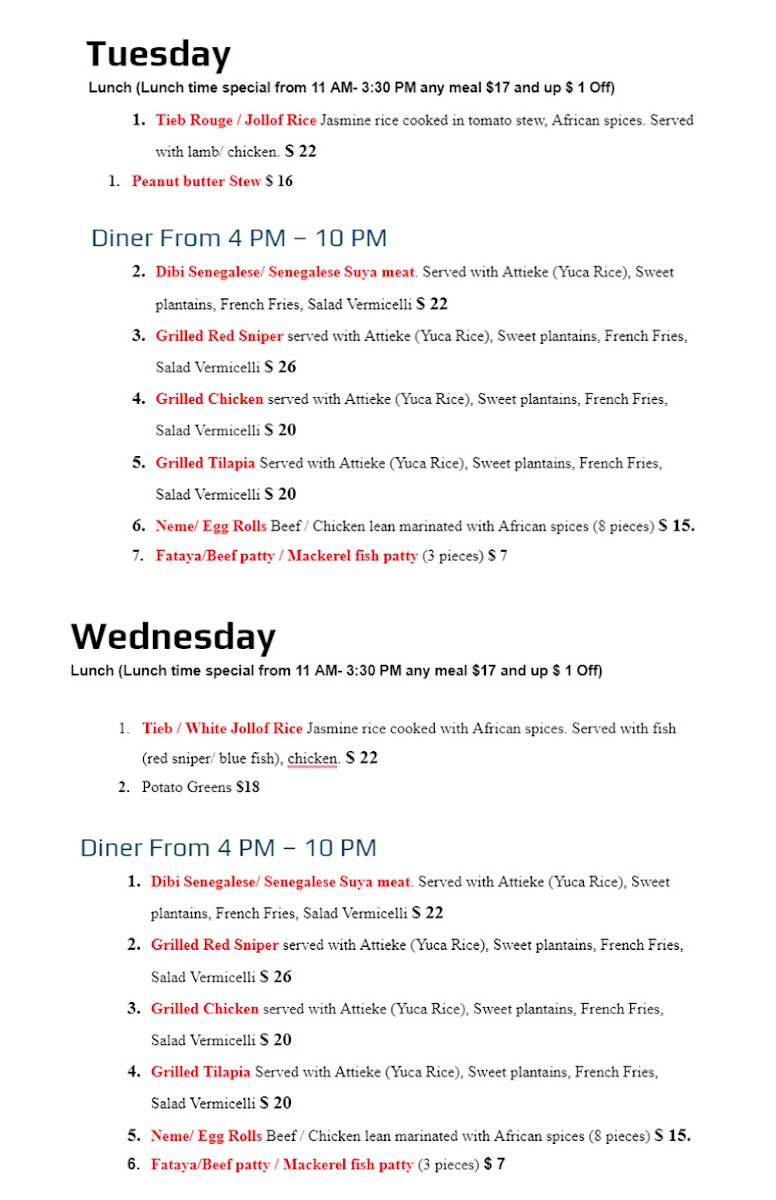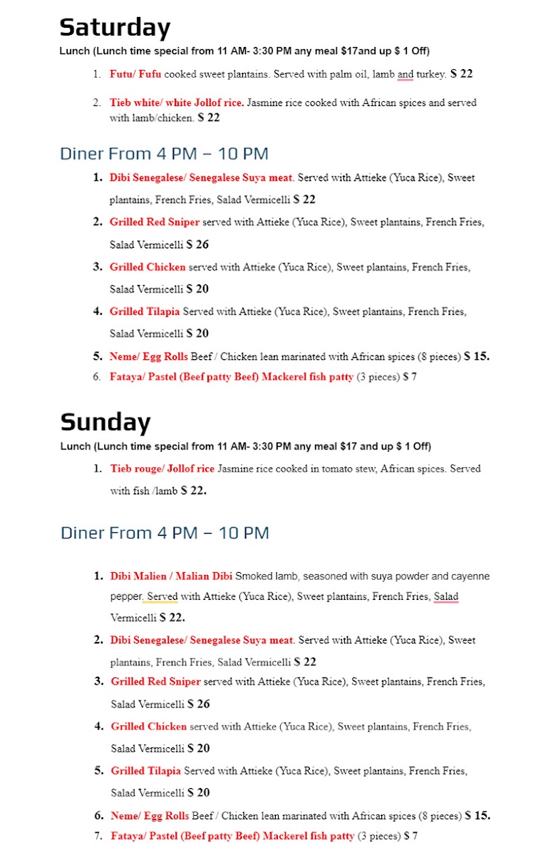 The all-day sides—such as sweet plantains and fufu—pair beautifully with the hearty soups and stews. Don’t forget to save room for dessert; the Degue is a creamy yogurt delight you won’t want to miss. Diners rave about the warmth of the staff and the inviting atmosphere, making Tima a perfect spot for casual dining or takeout. With everything prepared to perfection, it’s easy to see why patrons keep coming back for more.